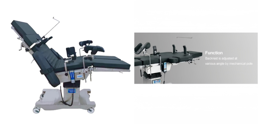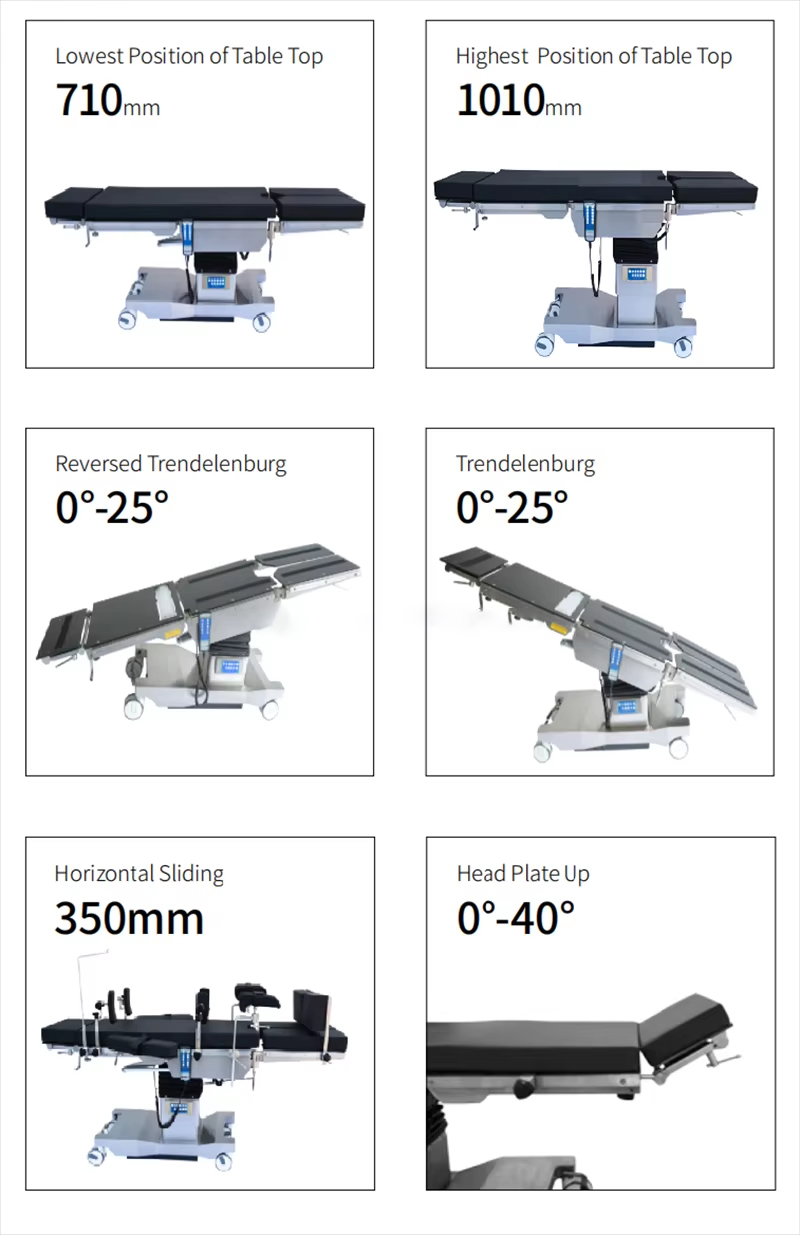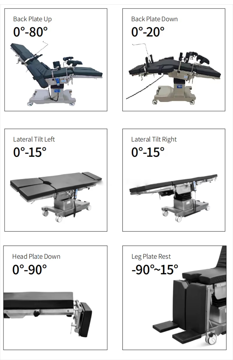 Tá an tábla roinnte ina cheithre chuid: ceann, cúl (lena n-áirítear droichead waist), alt cromáin agus cos; Tá an tábla déanta as ábhar ilchodach ard-neart le tarchur X-gha; Is féidir é a chomhoibriú le lámh C chun grianghraif a ghlacadh.