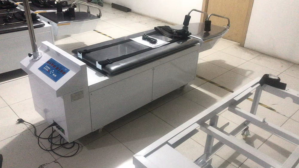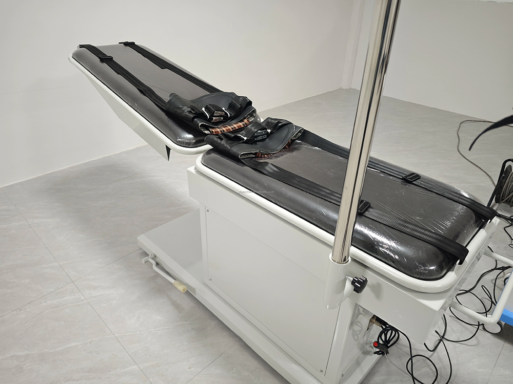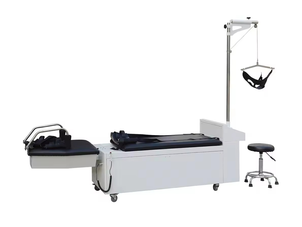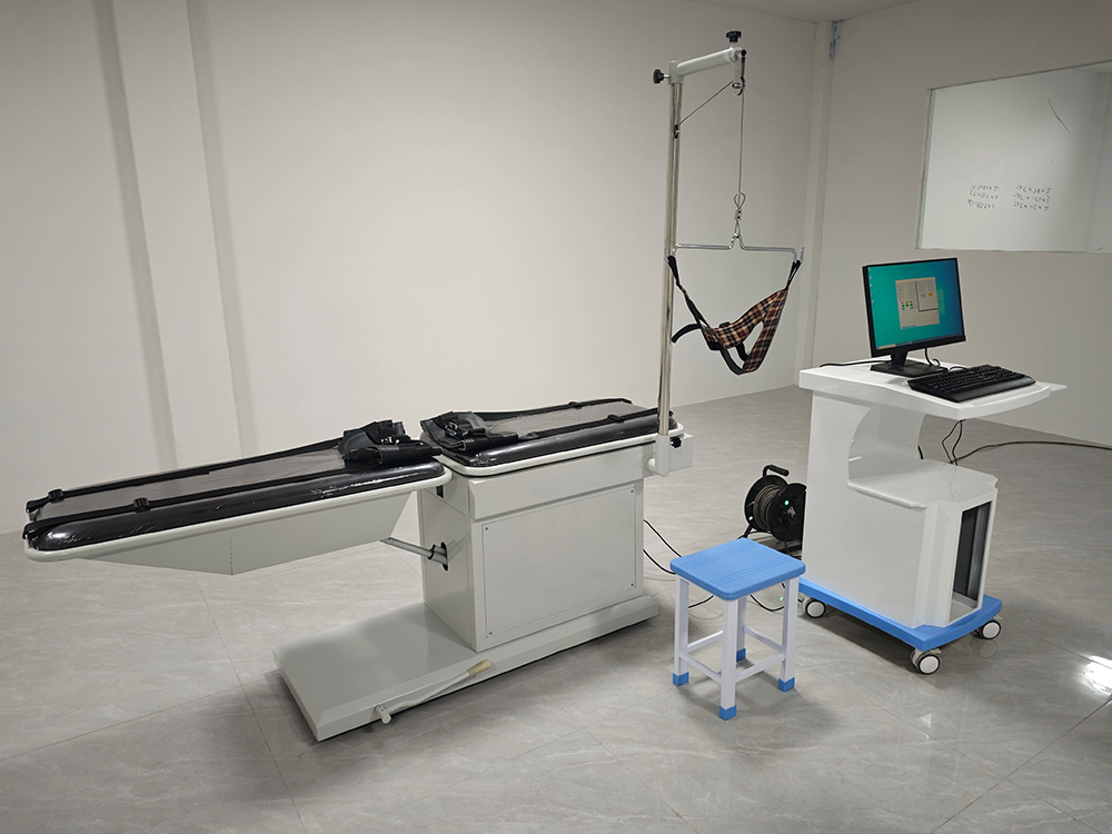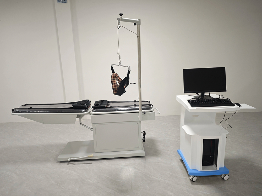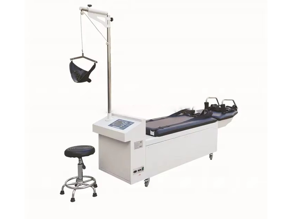 Is leaba tarraingt cóireála tríthoiseach cheirbheacsach agus spine lumbar é an táirge seo, agus tá na sonraí go léir á rialú ag microcontroller, taispeáint LCD, agus mótair líneach mar fhórsa tiomána, ag baint amach cóireáil chliste go hiomlán. Déantar rothlú agus uillinneacha uilleacha a thomhas ag baint úsáide as teicneolaíocht ionchódaithe uainíochta, rud a fhágann go bhfuil tomhas uillinn níos cruinne. Tá an éifeacht cóireála ceartúcháin suntasach go háirithe don chomhpháirteach lumbar posterior. I gcleachtas cliniciúil, is féidir tarraingt cothrománach, tarraingt uilleach, agus tarraingt rothlach a dhéanamh ar leithligh nó i dteannta a chéile chun neamhdhóthanacht aon ghníomhaíochta amháin a shárú agus tarraingt tríthoiseach a bhaint amach. Is féidir tarraingt lumbar agus tarraingt ceirbheacsach a dhéanamh go comhuaineach. Chun sábháilteacht an othair a áirithiú, nuair a bhíonn an teannas muineál níos mó ná 200N, ní mór an cnaipe dearbhaithe a bhrú sula méadaítear an teannas muineál. Nuair a mhothaíonn an t-othar tinn, is féidir leo an cnaipe cúlaithe éigeandála a bhrú agus tarraingeoidh an mheicníocht tarraingthe siar láithreach.