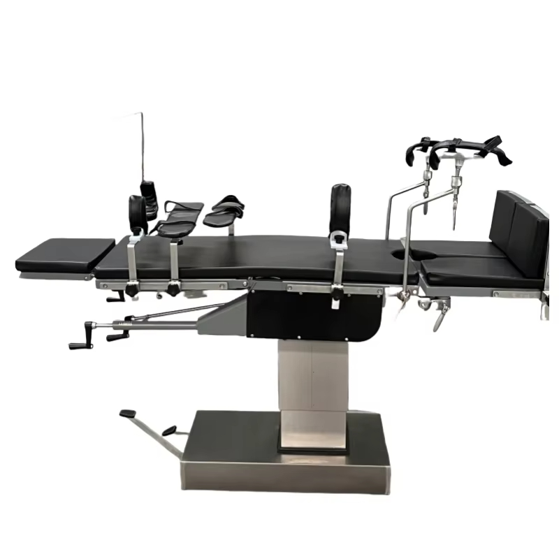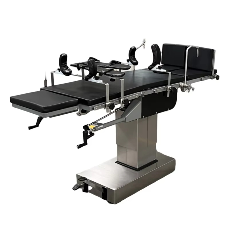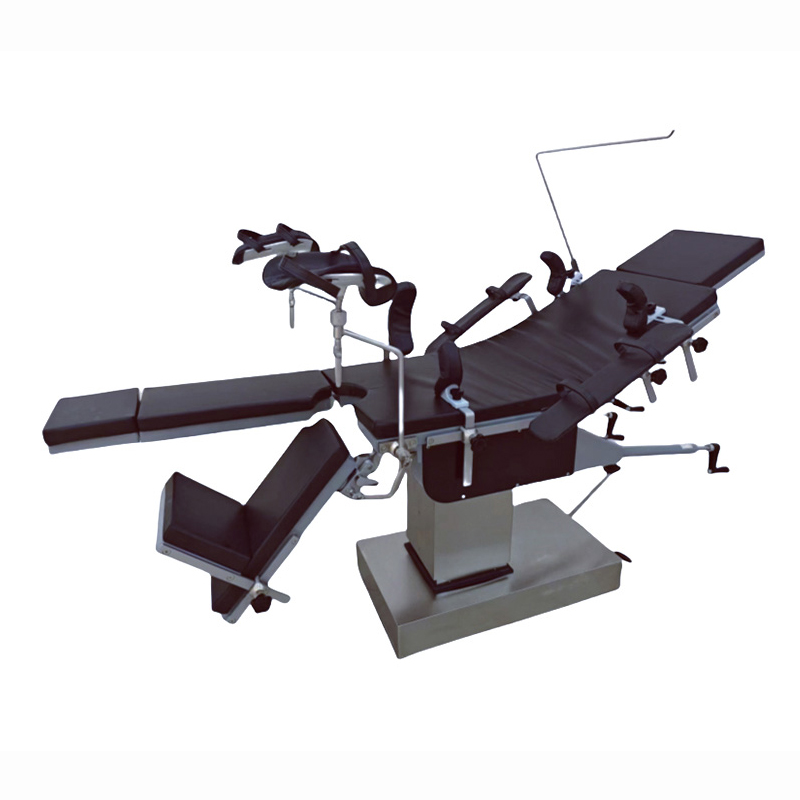 YGS3008B Is feiste leighis ardfheidhmíochta é tábla oibriúcháin hiodrálacha ilfheidhme atá oiriúnach le haghaidh oibríochtaí máinliachta éagsúla. Úsáidtear go forleathan é sa cheann agus muineál, cófra agus bolg, perineum, géaga, chomh maith le cnáimhseachas, gínéiceolaíocht, oftailmeolaíocht, otolaryngology, agus ortaipéidic. Is éard atá sa tábla oibriúcháin ná headboard, cúlchlár, waistboard, hipboard, agus clár cos scoilte. Is féidir gach comhpháirt a choigeartú go beacht. Is féidir fillte suas agus síos, tilting tosaigh agus cúil, tilting chlé agus ar dheis an chúlchláir agus an bhoird chos a rialú le giaranna cranked láimhe, giaranna péisteanna, agus córais raca chun cobhsaíocht agus cruinneas na hoibríochta a chinntiú. Tá an córas ardaithe hiodrálacha á thiomáint ag caidéal hiodrálacha cos-oibrithe, atá éasca le feidhmiú agus gan torann, agus is féidir leis na riachtanais a bhaineann le coigeartú airde go minic a chomhlíonadh. Glacann an tábla oibriúcháin boird cruach carbóin brataithe le spraeáil, atá resistant creimeadh, frith-ocsaídeach, agus éasca le glanadh. Tá na sliogáin bonn agus colún déanta as cruach dhosmálta, atá buan agus cobhsaí.